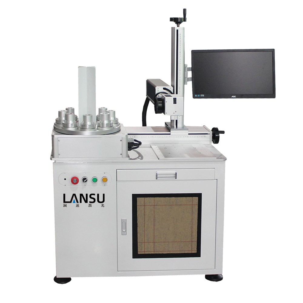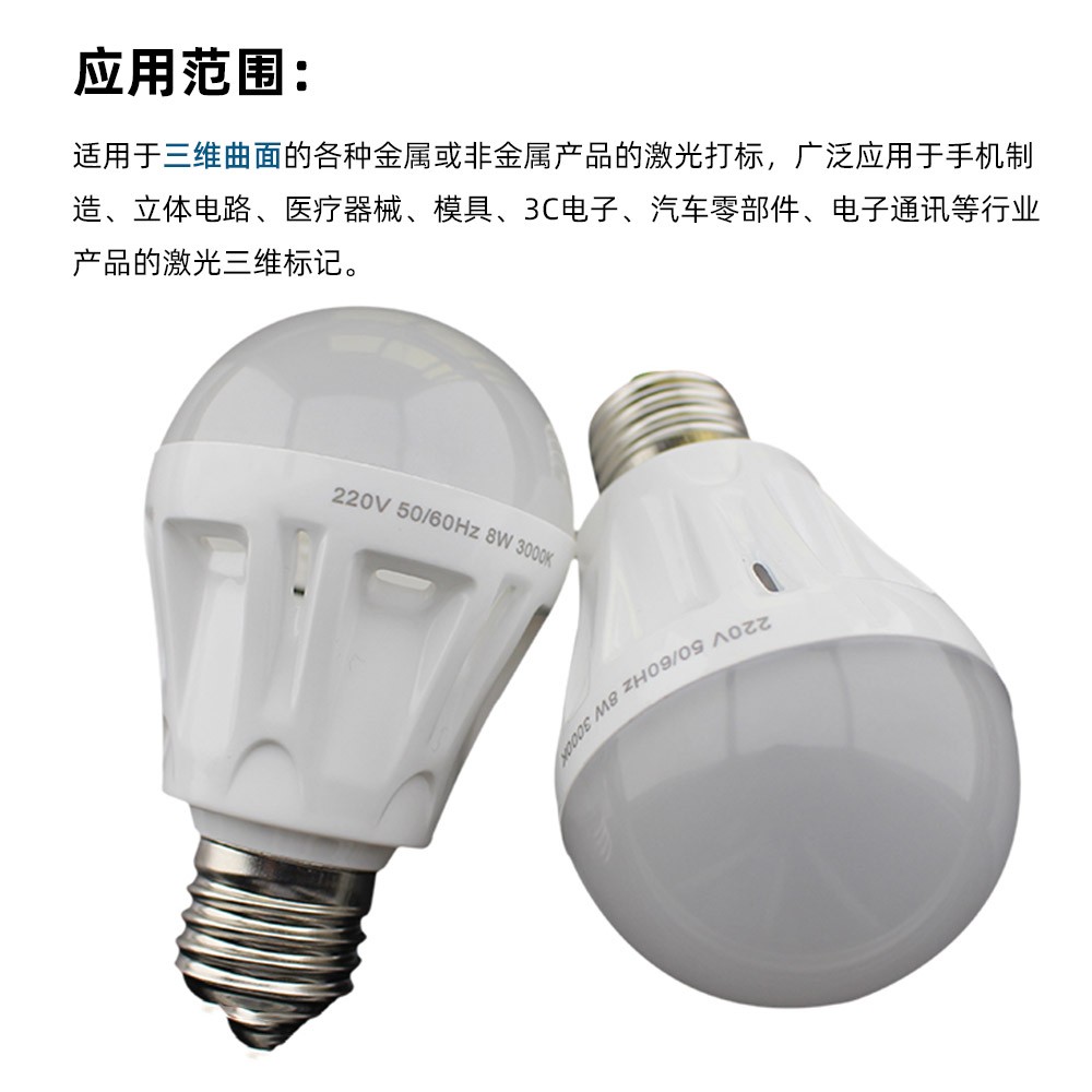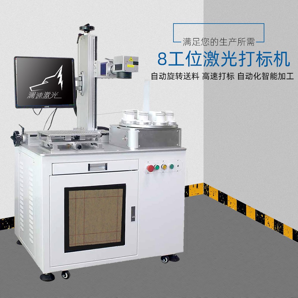 LED激光打標(biāo)機(jī)采用八工位(視產(chǎn)品具體情況可設(shè)計(jì)為6工位或4工位)3D立體旋轉(zhuǎn)轉(zhuǎn)盤(pán)設(shè)計(jì),光路X、Z軸手動(dòng)移動(dòng)可調(diào),單個(gè)工位之間獨(dú)立工作,自動(dòng)360°旋轉(zhuǎn),減少上下料時(shí)間,提高工作效率。適用于產(chǎn)量在10K/d以上的球泡燈、要求打雙面、三面或360°旋轉(zhuǎn)打標(biāo)的產(chǎn)品等,整臺(tái)機(jī)器的操作只需要普通人工進(jìn)行手動(dòng)上料一個(gè)簡(jiǎn)易環(huán)節(jié),雙工作臺(tái),平面打標(biāo),圓周打標(biāo)一機(jī)兩用,操作簡(jiǎn)單,速度快,效率高,標(biāo)刻清晰,無(wú)損耗。